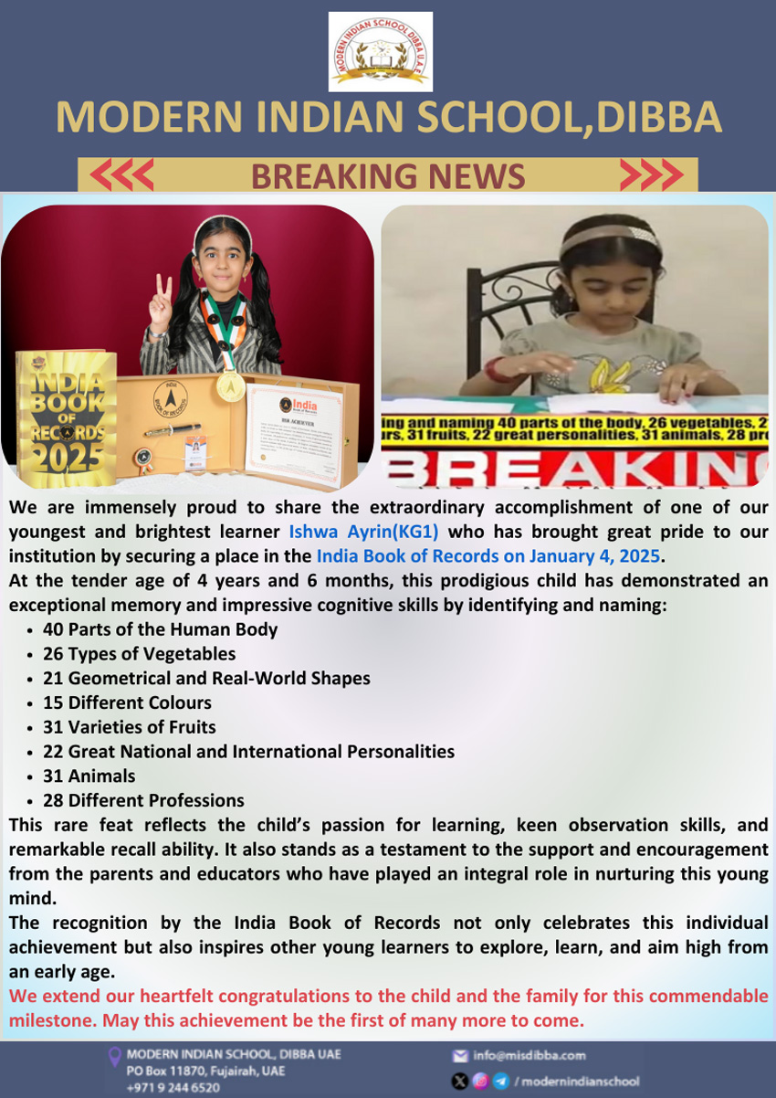 We are immensely proud to share the extraordinary accomplishment of one of our youngest and brightest learner Ishwa Ayrin(KG1) who has brought great pride to our institution by securing a place in the India Book of Records on January 4, 2025.